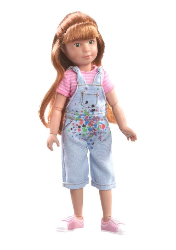 Кукла Хлоя в одежде художницы. На кукле розовая футболка, комбинезон с имитацией краски на нем и розовые кроссовки.