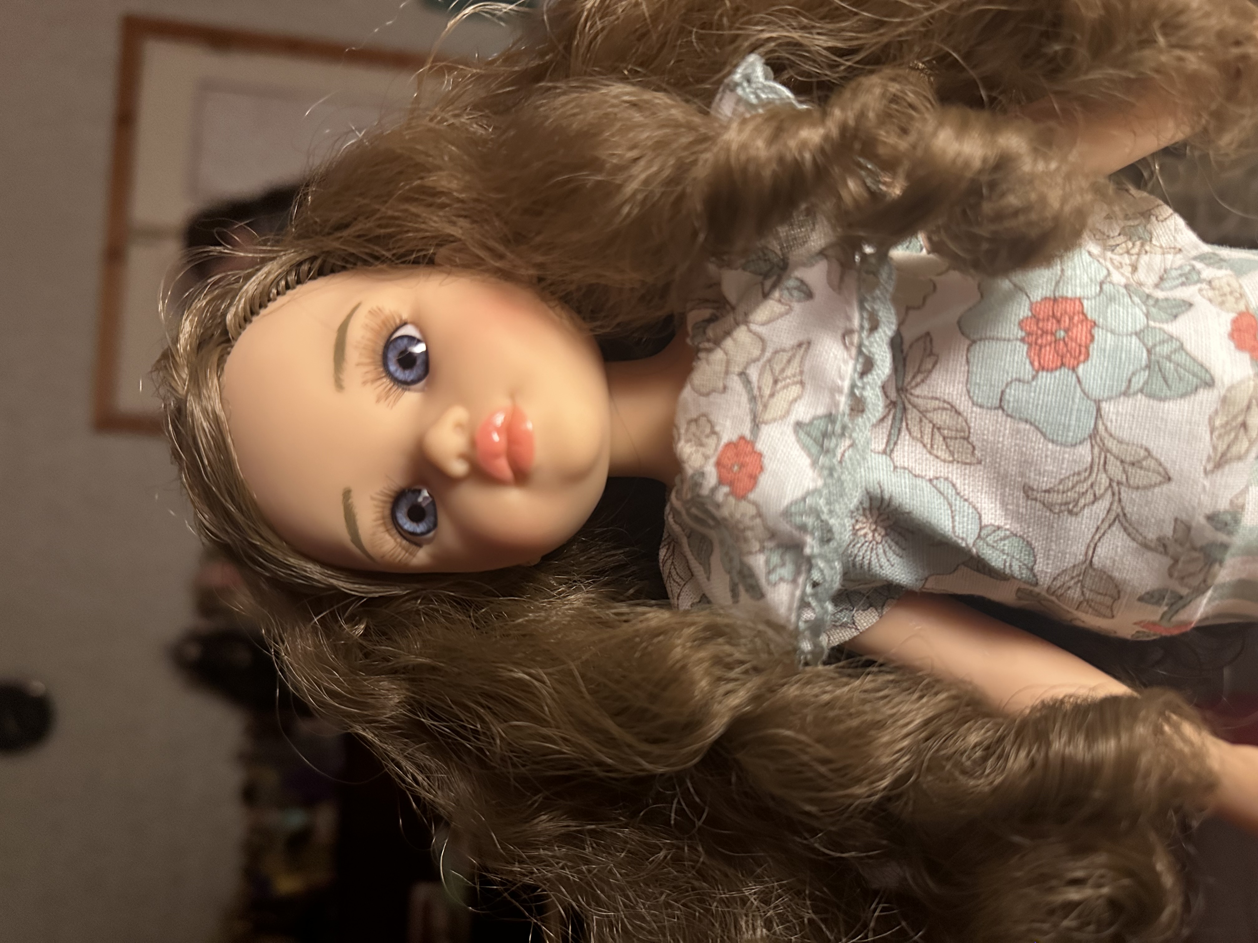 Елена Шабулдо04 декабря 2025Девочка Кармен-кудряшка очень красивая, волос много, но в первоначальном виде из оставить нельзя. Волосы надо освободить от резинок и в течение 2х часов надо привести из в порядок. Расческа, карандаш и терпение. Разобрать волосы на небольшие, прядки, прядку очень хорошо расчесать, скрутить в жгутик и накрутить на карандаш и у вас получатся локоны. Идти от одного края к другому. Куколка устойчива даже с такой копной волос.