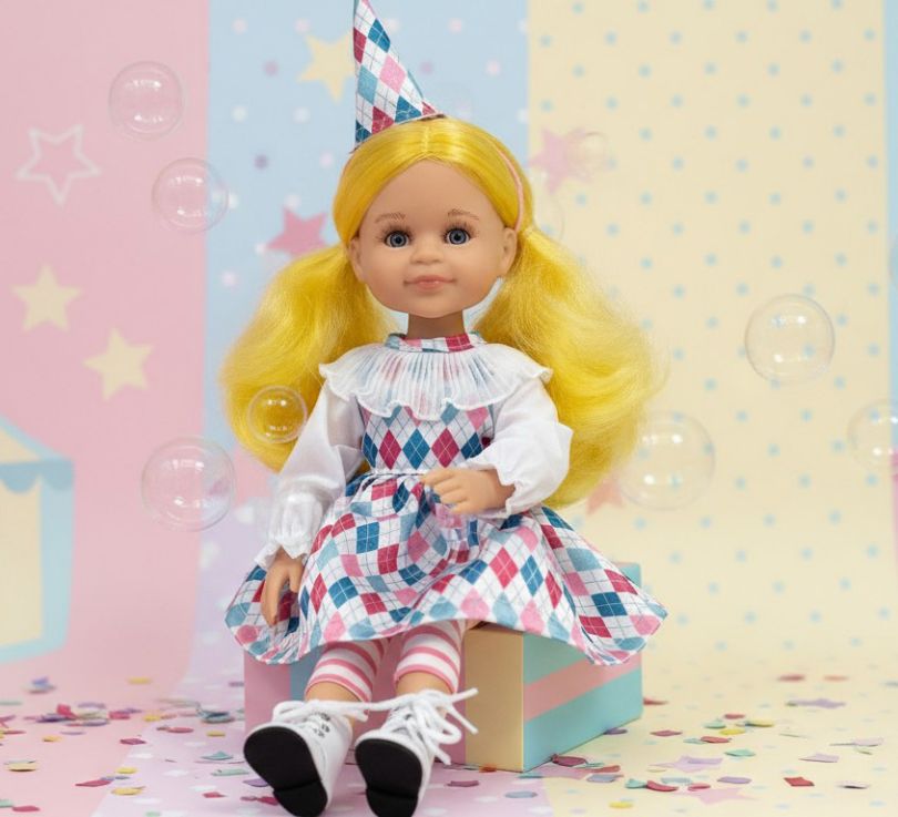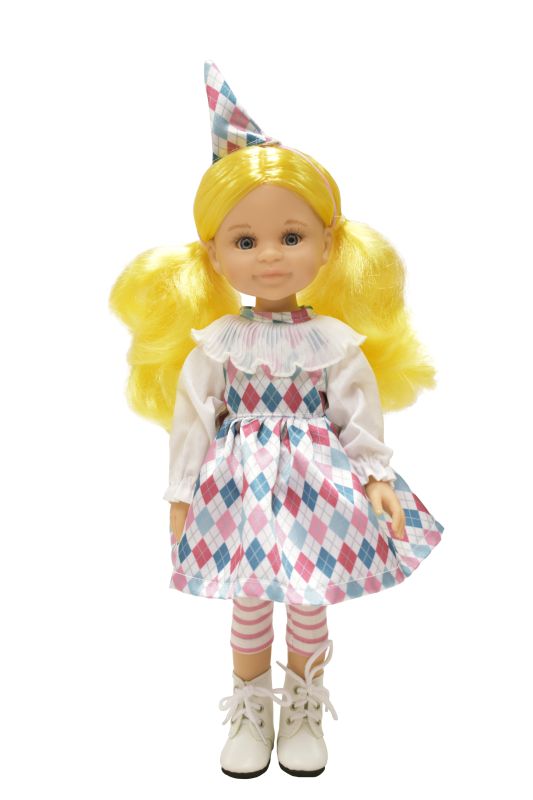 Карнавальный костюм новой куклы Paola Reina состоит из яркого с традиционным рисунком в ромбик атласного платья, украшенного рюшами по горловине и кокетливой сборкой на манжете у длинных рукавов, полосатых леггинсов и веселого колпачка с таким же рисунком, как на платье. Подчеркивает праздничный образ кукол фирменная обувь: белые высокие ботиночки на шнуровке.