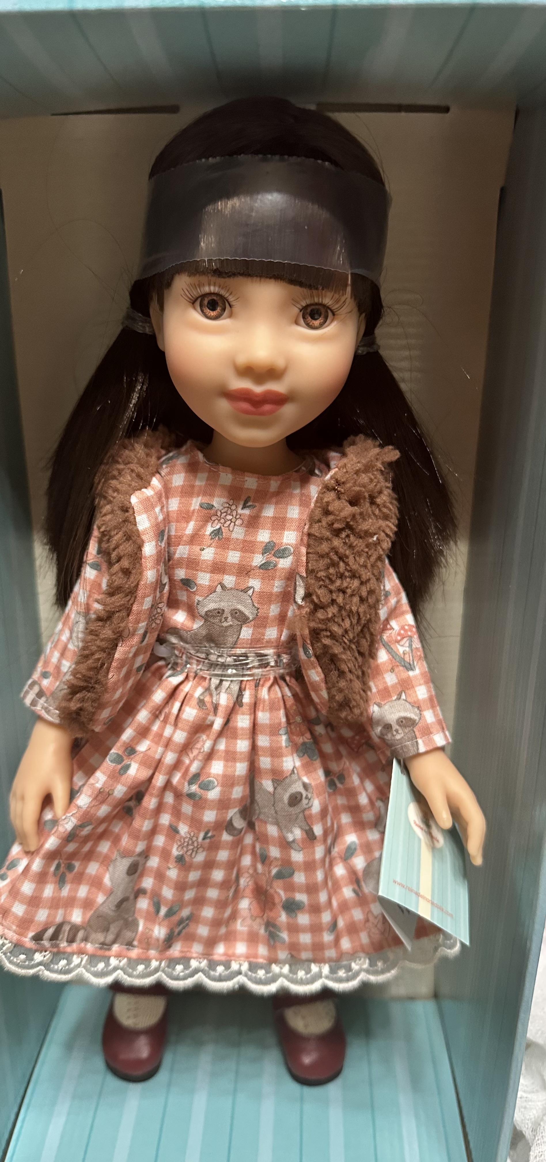 Очаровательная Эмма с милой прической «хвостики» и ласковыми карими глазами одета в клетчатое платье с прелестным рисунком, на котором изображены веселые еноты. Тонкое кружево по подолу платья добавляет её образу кокетства, а меховой жилет насыщенного шоколадного цвета на подкладе в тон платья, ажурные кремовые носочки и коричневые туфельки в стиле «Mary Jane» прекрасно завершают этот симпатичный образ.У куклы нежный ванильный аромат; уникальный и неповторимый дизайн лица и тела; ручная работа (ресницы, веснушки, щечки, губы, прическа); волосы легко расчесываются и блестят; глазки не закрываются; ручки, ножки и голова поворачиваются.