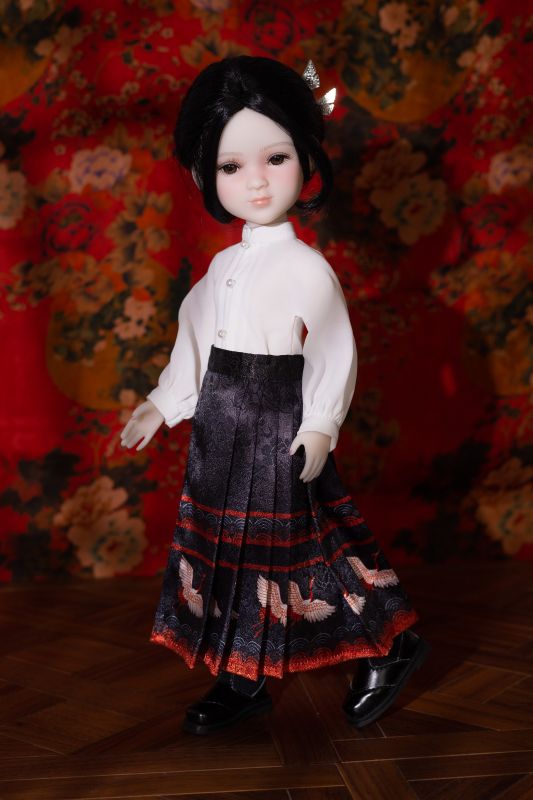 Основа наряда Новы – это белая рубашка с длинными рукавами и воротником-стойкой, украшенным пуговицами-бусинками, похожими на жемчужины. Пышные рукава рубашки, присборенные на манжетах, придают наряду строгость и элегантность. Традиционная китайская женская юбка, выполненная из ткани, похожей на атлас, украшена рисунком с журавлями.